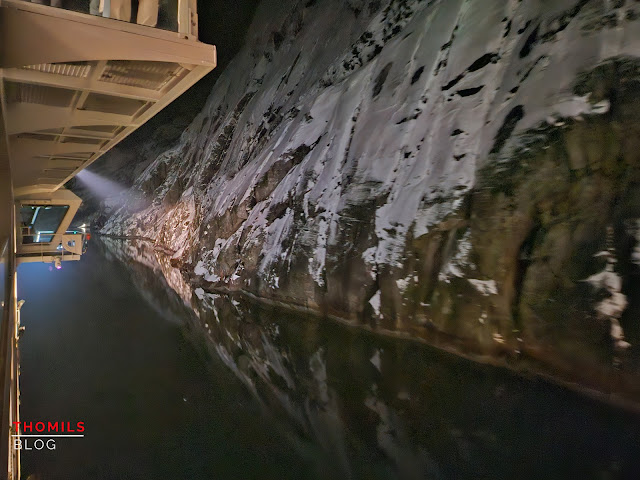 Overnight, the Barents Sea had made us pay for the spectacle of the northern lights we’d seen the previous evening. It had been a rough passage and I’d been tossed around in bed quite a bit. Still, when my alarm went off, I felt surprisingly good, although I wasn’t sure where I was slowly getting my sea legs or it was just the effects of the seasickness tablets. Showering still turned out to be quite the rodeo, with me once again being thankful for the handholds in the shower, as well as the floor drains and watertight hatch to the bathroom. It took some time for me to get dressed and ready and so I opted for a late breakfast for the café, consisting of a coffee and one of Havila’s excellent cinnamon rolls. Our southbound track was beginning to make itself felt. Whilst the sun still only barely made it over the horizon, the days were just that little bit longer, that little bit brighter. Whilst the landscape was as foreboding and fascinating as it had been on the way north. That sense of “magnificent desolation” I’d mentioned during my abortive excursion to the North Cape was in full swing as we made our way through a number of protected sounds to Hammerfest.